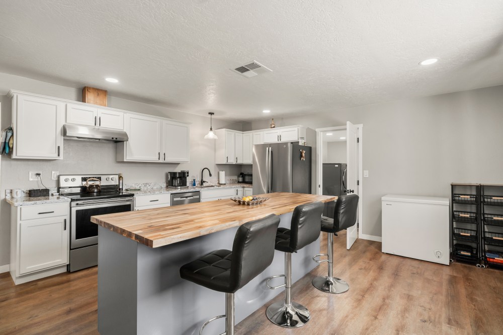 - An updated kitchen with center island and granite counters