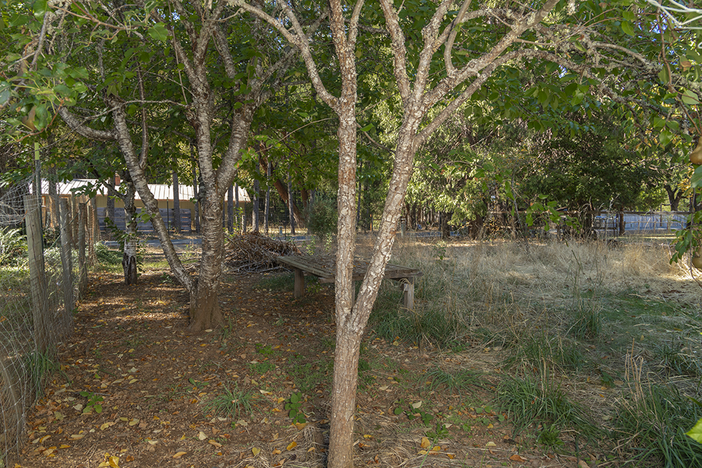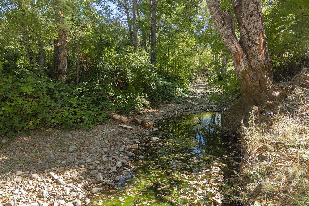 Along the back border, Thompson Creek winds its way through the property — a seasonal waterway that brings sound and movement to the land. In wetter months, it hums with energy; by late summer, it quiets to a trickle, leaving behind the cool shade and fertile soil that feed the property’s trees and gardens.